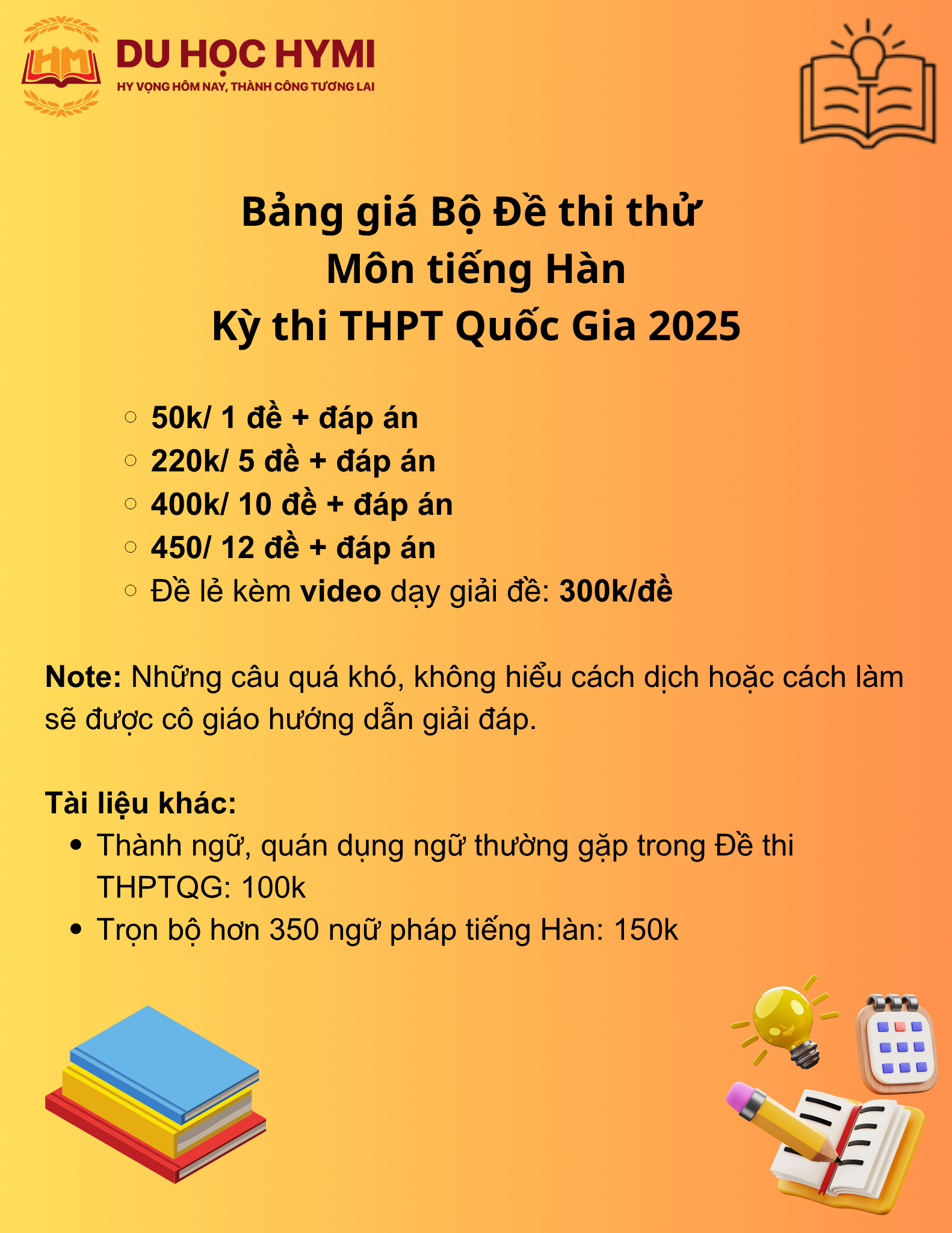 Tại Hymi, đội ngũ chuyên gia tiếng Hàn trình độ Tiến sĩ – Thạc sĩ dựa trên sự phân tích kỹ lưỡng, tỉ mỉ, đúc rút ra các dạng bài thường gặp cũng như các thành ngữ, tục ngữ, quán dụng ngữ thường xuất hiện nhất trong bài thi tiếng Hàn kỳ thi THPT Quốc Gia 2025 để biên soạn ra những bộ đề thi sát với đề thi thật nhất. Giúp các sĩ tử có thể luyện tập hiệu quả trước kỳ thi, rút ngắn thời gian ôn luyện, tập trung mục tiêu và đạt được thành tích thật cao trong kỳ thi sắp tới. Cùng tham khảo đề thi thử minh họa được đội ngũ chuyên gia biên soạn nhé.
