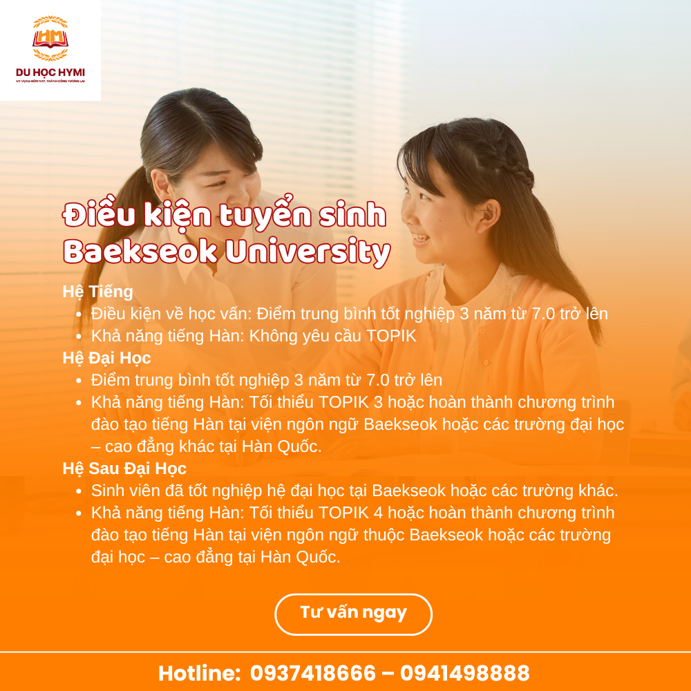 • Có TOPIK 3 hoặc hoàn thành khóa đào tạo tiếng tại Viện Ngôn ngữ Baekseok hoặc tại các trường đại học – cao đẳng khác ở Hàn Quốc