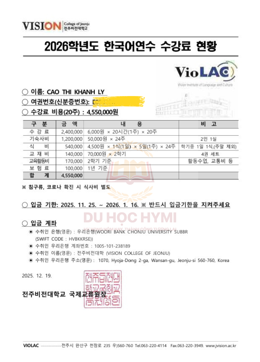 Trong hành trình du học Hàn Quốc, việc nhận được invoice từ trường đại học không chỉ là một bước thủ tục cần thiết, mà còn là cột mốc quan trọng khẳng định sự sẵn sàng về hồ sơ, năng lực và lộ trình học tập của du học sinh. HYMI xin trân trọng chúc mừng Cao Thị Khánh Ly khi bạn đã chính thức nhận invoice từ Trường Đại học Jeonju Vision (Hàn Quốc), sẵn sàng tiến gần hơn đến mục tiêu trở thành tân du học sinh trong kỳ nhập học tháng 3 sắp tới.
