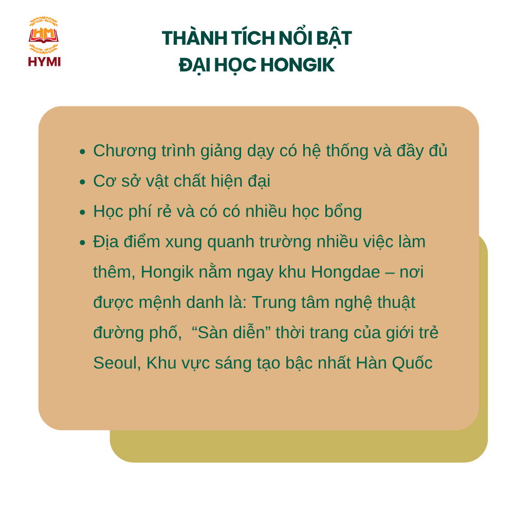 Khi nhắc đến du học tại Hàn Quốc trong lĩnh vực nghệ thuật và thiết kế, Đại học Hongik gần như là cái tên được nhắc đến đầu tiên. Không chỉ nổi tiếng tại Hàn Quốc, Hongik còn được đánh giá là một trong những ngôi trường đào tạo sáng tạo hàng đầu châu Á, nơi quy tụ những tài năng trẻ trong các lĩnh vực mỹ thuật, thiết kế và nghệ thuật biểu diễn.