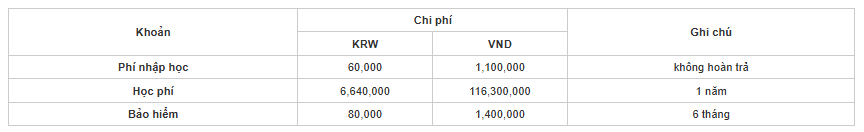 • Học phí chuyên ngành: 3.470.000 – 5.264.000 KRW/kỳ.
