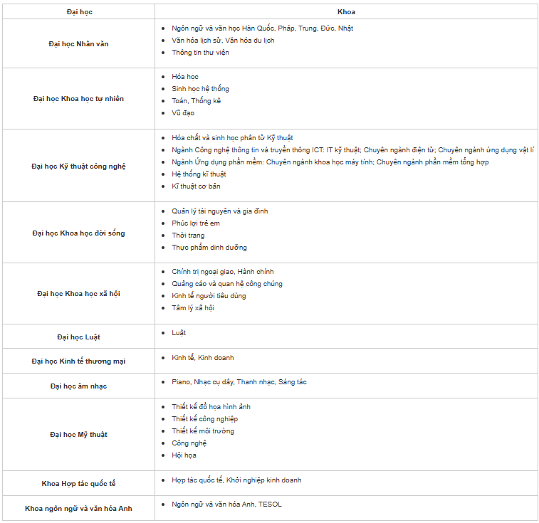 • Phí xét tuyển: 150.000 KRW (khoa Vũ đạo, Âm nhạc & Mỹ thuật: 200.000 KRW).