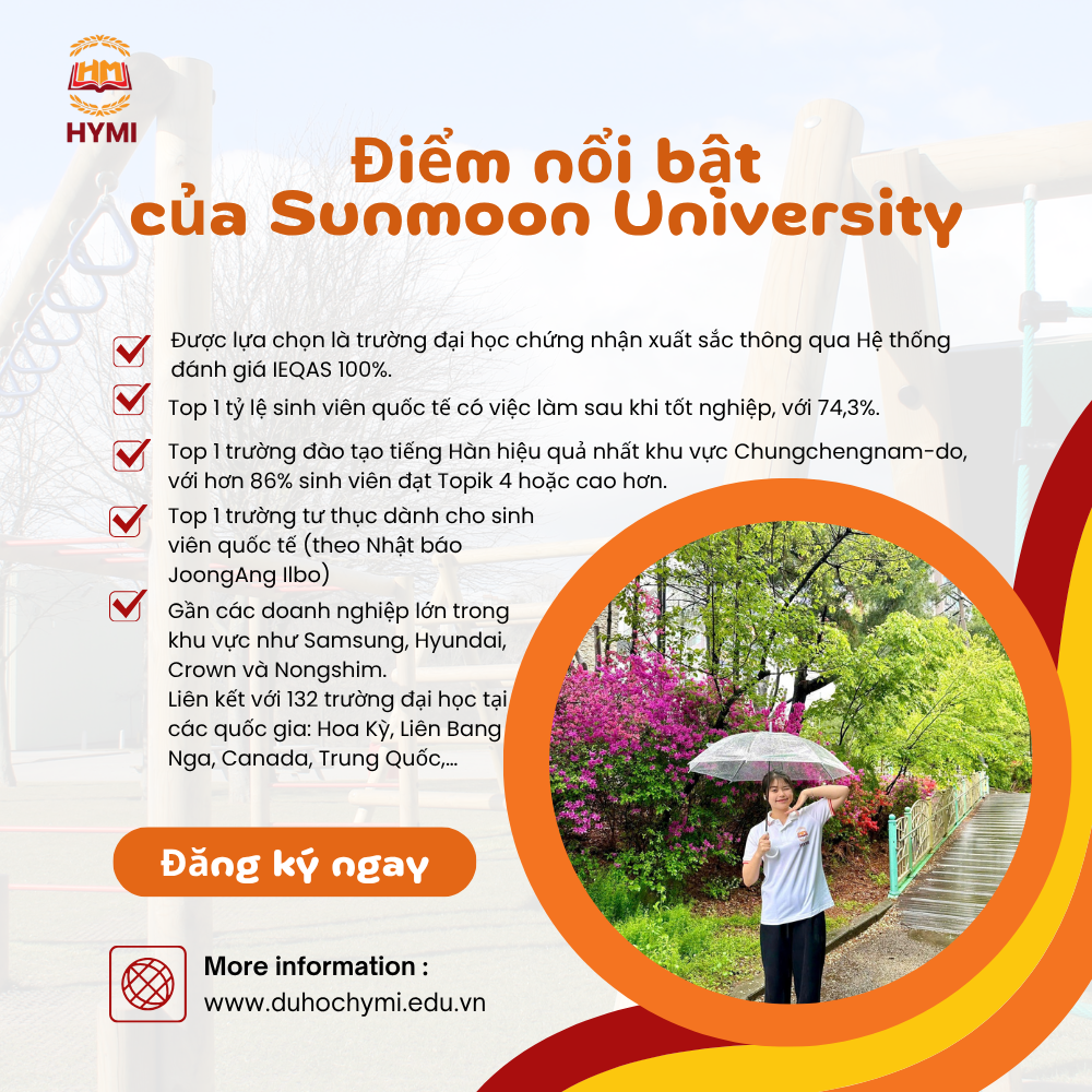 Trong hành trình đi tìm tri thức và khẳng định bản thân nơi xứ sở kim chi, Đại học Sunmoon luôn được xem là điểm đến của những người trẻ khao khát không chỉ học tập mà còn kiến tạo tương lai bền vững. Năm 2025, HYMI chính thức trở thành đơn vị tuyển sinh trực tiếp của Đại học Sunmoon tại Việt Nam, mở ra cánh cửa du học nhanh chóng, minh bạch và đầy triển vọng cho các bạn trẻ yêu mến đất nước Hàn Quốc. Ngoài Sunmoon, Hymi hợp tác tuyển sinh trực tiếp cho các trường đại học toàn Hàn Quốc, nên nếu cần tư vấn chọn trường du học tại Hàn, đừng ngần ngại hãy liên hệ Hymi nhé.