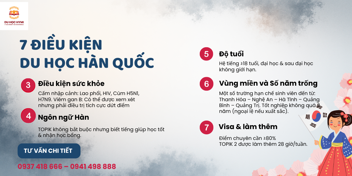 Dưới đây là bản tổng hợp chi tiết và đầy đủ nhất về 7 nhóm điều kiện du học Hàn Quốc 2024, được diễn giải theo cách dễ hiểu, có hệ thống và cập nhật đúng tinh thần quy định hiện hành.