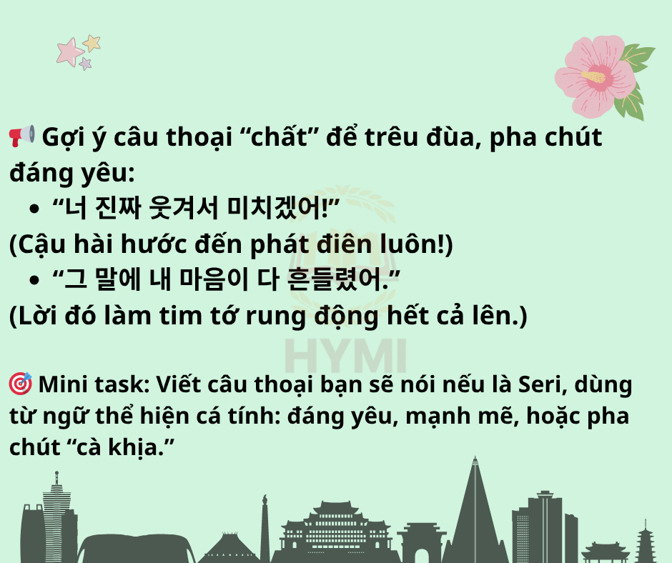 Vậy hãy thử đóng vai theo hướng dẫn dưới đây để học tiếng Hàn cùng Hymi nhé: