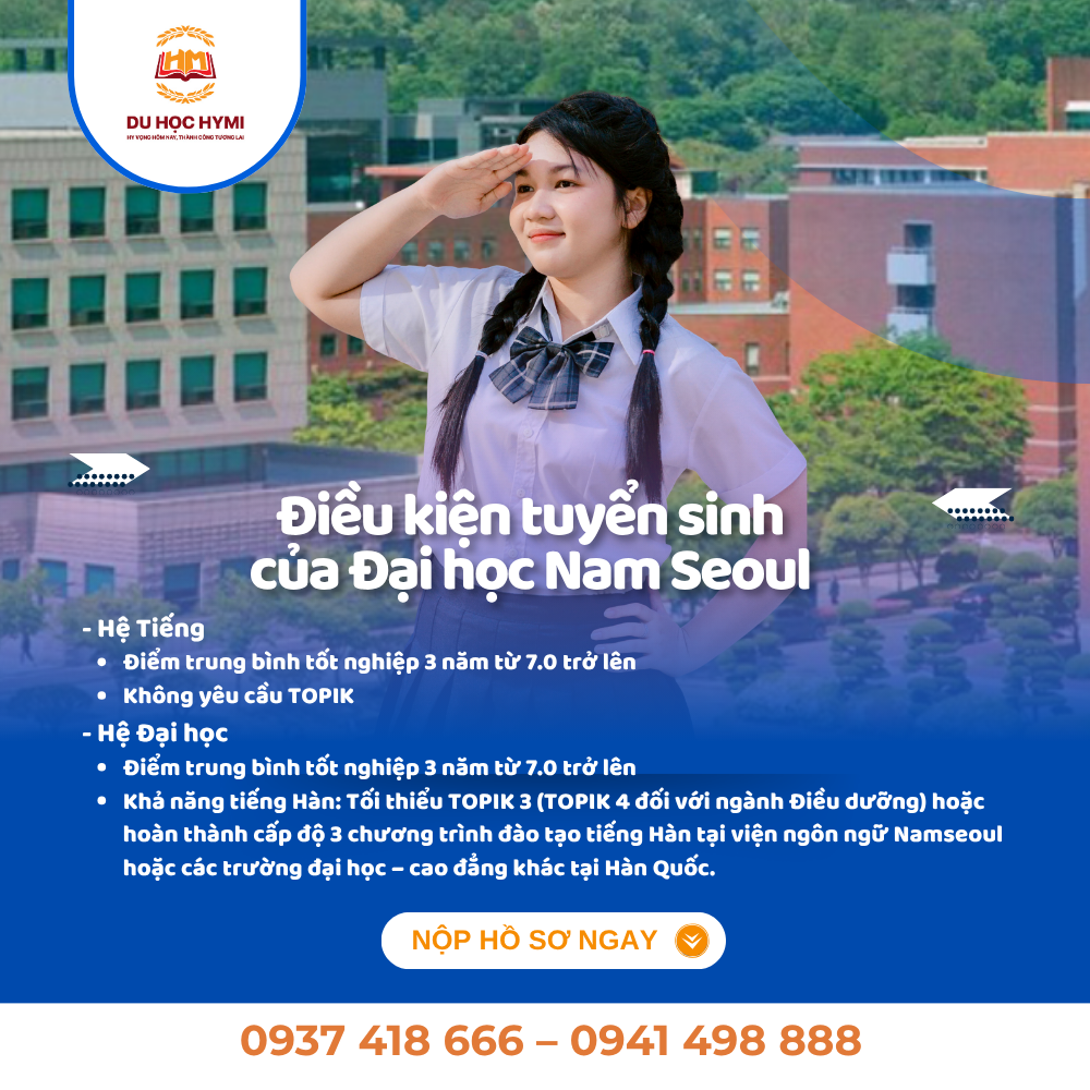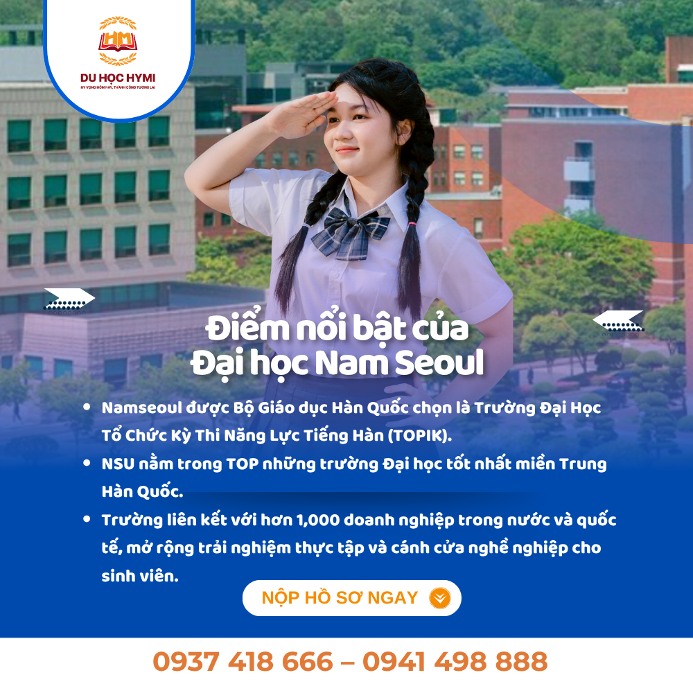 Đừng bỏ lỡ cơ hội: Hymi đã mở đơn tuyển sinh chính thức cho Đại học Namseoul – TOP 2 học phí tốt nhất tại miền Trung Hàn Quốc. Đây là thời điểm để bạn nắm bắt cơ hội, chuẩn bị hồ sơ và bắt đầu hành trình du học trọn vẹn, đúng hướng, hiệu quả.