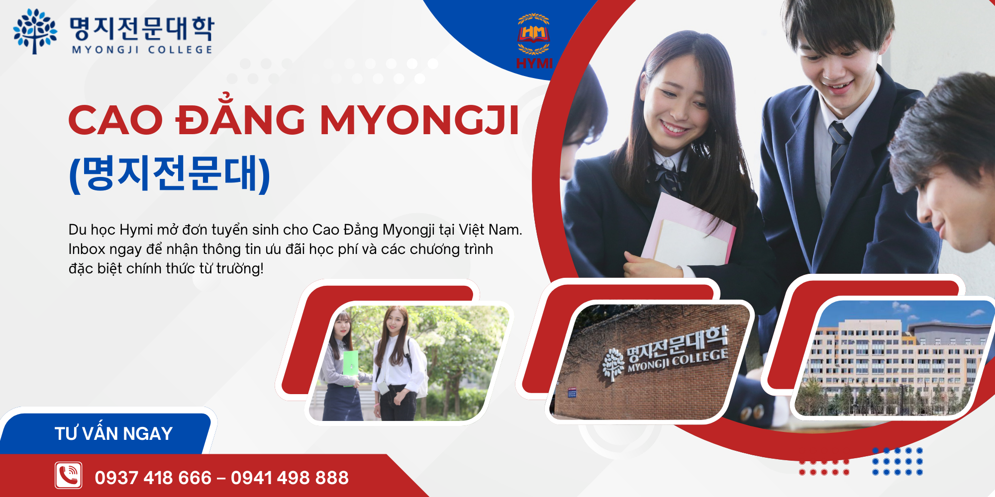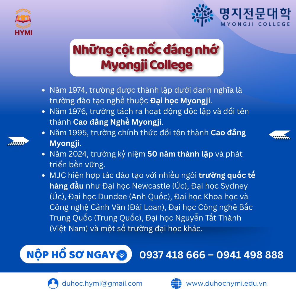 HYMI là đơn vị tư vấn du học chuyên sâu, trực tiếp liên kết với nhiều trường cao đẳng – đại học tại Hàn Quốc, trong đó có Myongji College. Đến với HYMI, học sinh được hỗ trợ toàn diện:
